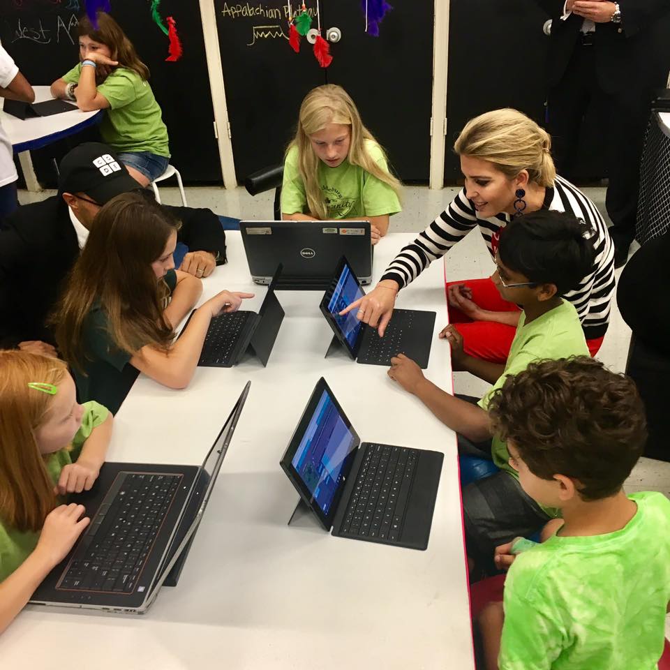 Ivanka estuvo interactuando con los estudiantes en computadoras haciendo ejercicios de Codificación.