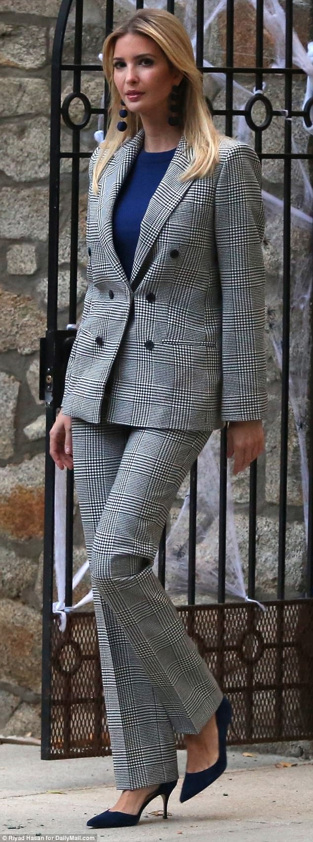Ivanka traía un coordinado con líneas entrecruzadas blancas y negras, que dan la impresión de cuadritos negros, su saco de doble pecho.